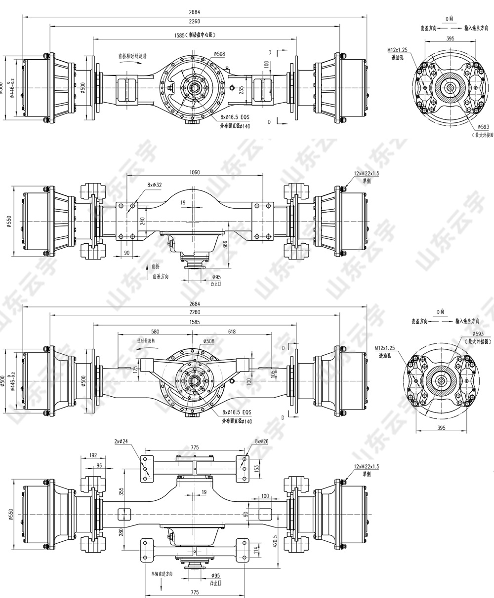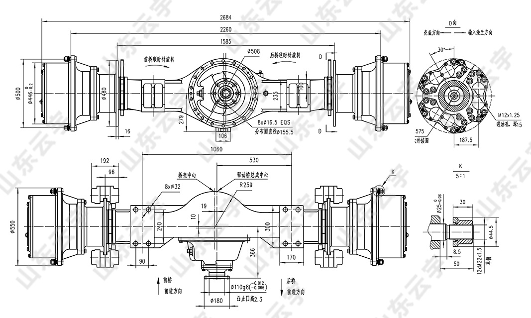 ● Two-stage decelerating structure is adopted for the drive axle. ● The spiral bevel gears with great load-carrying capacity and high efficiency are adopted for main drive. ● The wheel is planetary decelerating structure. ● The main reducer is equipped with the common bevel-gear differential mechrmism simple slructure and flexible differential fimctum. ● The cast steel with adequate rigidity servers as material for the axle housing. ● The brakein clamydisc braking mode has great braking moment. ● The drive axle is suitable for the ZL60 loader and 220horsepower tractor. |