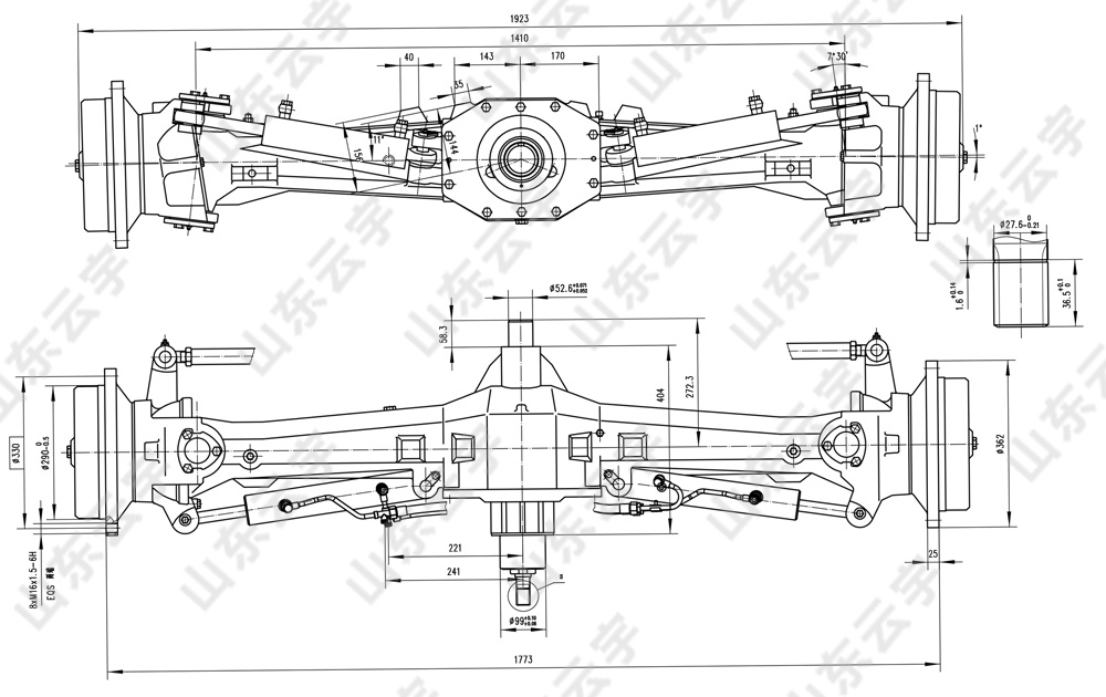 ● Two-stage decelerating structure is adopted for steeringdrive axle.universal joint rotating at constant angular velocity is adopted to connet the inner semi shaft with the drive shaft.with the drive shaft. ● Integral-type ductile-iron axle housing with adequaterigidity and light weight is adopted. ● Centrally positioned transmission shaft and swing-typecentral swing pin are adopted. ● Front-wheel steering solely under hydraulic pressure,the steering angle can reach 50。. ● Suitable for 80-100 horsepower four-wheel drive tractorand similar products. |