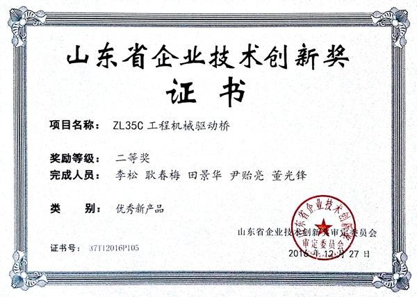 Shandong Enterprise Technology Innovation Award Certificate (ZL35C construction machinery drive axle)