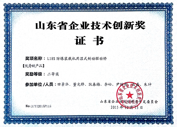 Certificate of Shandong Enterprise Technology Innovation Award (L18S wet loader drive axle for explosion proof loader)