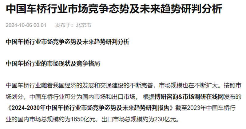中國車橋行業(yè)隨著我國經(jīng)濟(jì)的發(fā)展和交通建設(shè)的不斷完善,市場規(guī)模也在不斷擴(kuò)大。按照市場劃分,中國車橋行業(yè)可分為國內(nèi)市場和出口市場。 根據(jù)博研咨詢&市場調(diào)研在線網(wǎng)發(fā)布的《2024-2030年中國車... 詳細(xì)>>